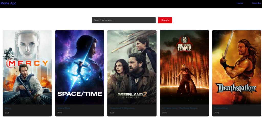 Rakenduse juurkomponent, mis haldab marsruutimist (routing) ja peamisi lehti (Home ja Favorites)