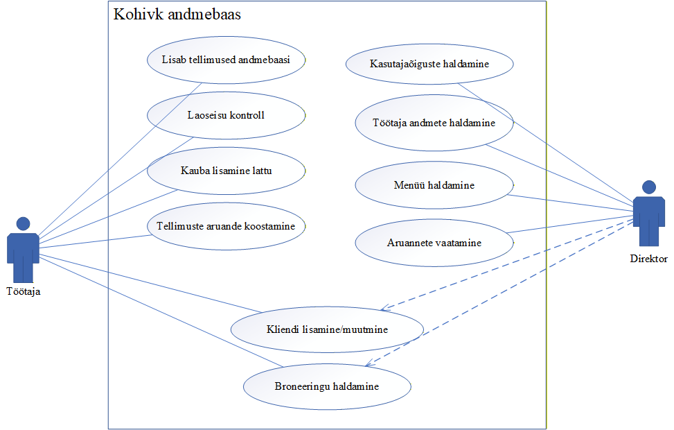 Kasutuslooskeem (Use case diagram) näitab, millised kasutajad (aktorid) süsteemiga suhtlevad ja milliseid põhifunktsioone see neile pakub.