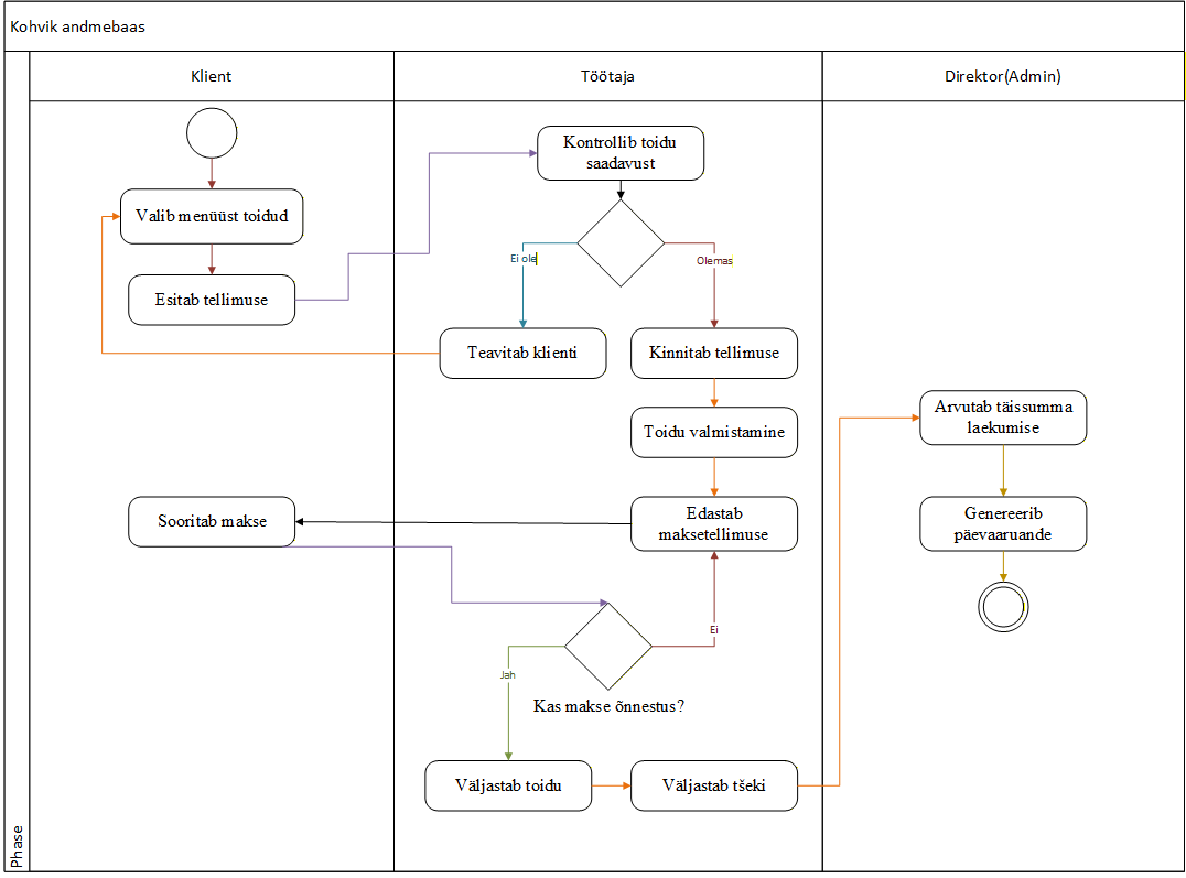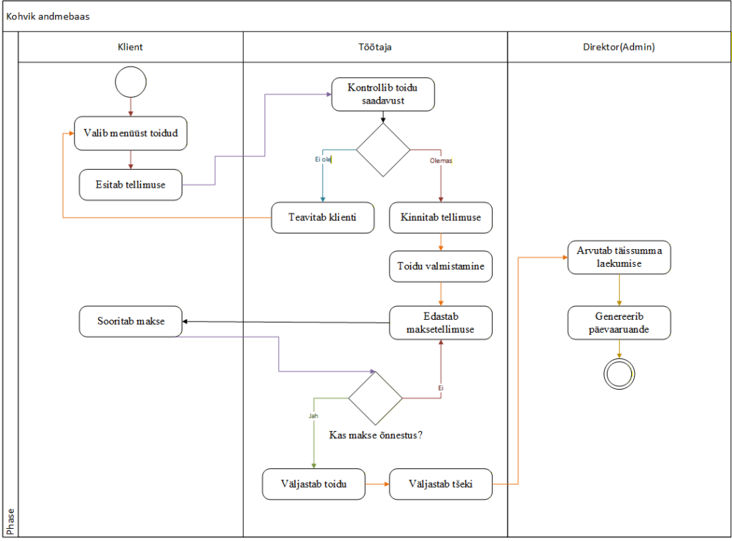 Tegevusskeem (Activity diagram) kirjeldab protsessi samm-sammulist kulgemist koos rollide jaotuse ja valikukohtadega.