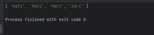 5. Kirjuta noolefunktsioon nimega leiaUnikaalsedNimed, mis võtab sisendiks massiivi erinevatest nimedest ning tagastab uue massiivi, kus on ainult unikaalsed nimed esialgses järjekorras. See tähendab, et kui esineb mitu sama nime, siis tuleb need jätta ainult esinemise esialgsesse kohta ja eemaldada ülejäänud koopiad.["Kati", "Mati", "Kati", "Mari", "Mati", "Jüri"]